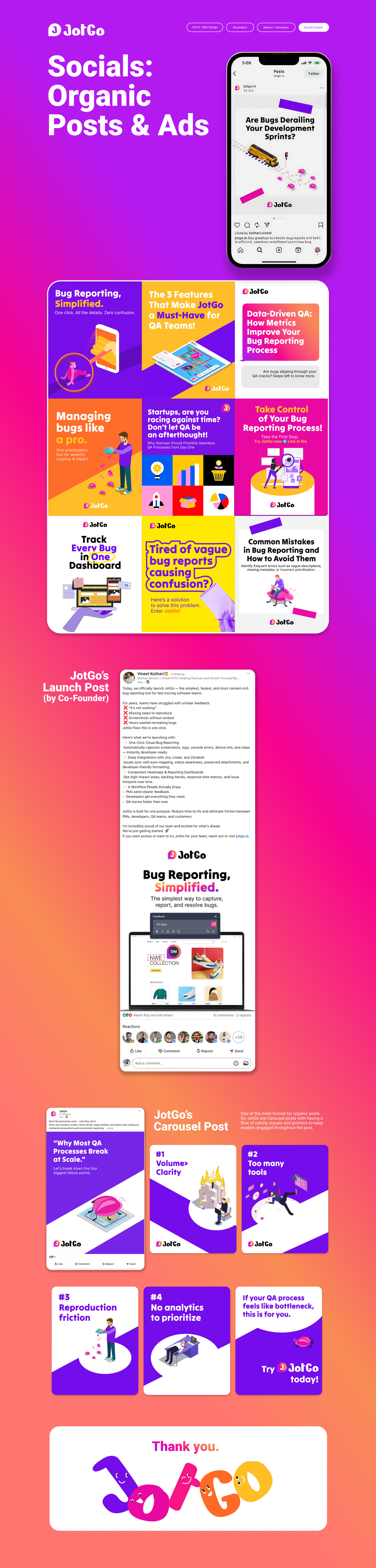 Branding / Website / Illustrations / Social Media Content / Tech SaaS JotGo is a powerful, game-changing bug management tool built for QA and development teams to collaborate in real time. Designed to simplify the bug reporting and tracking process, JotGo streamlines communication, boosts productivity, and helps teams deliver higher-quality software faster. With intuitive workflows, instant updates, and smart integrations, it redefines how teams manage issues — making bug management simpler, faster, and more effective in the long run. Creative Lead & Direction by Fel Utama. Design Assist by Zafhir Nordin. Project of Digital Avenues.