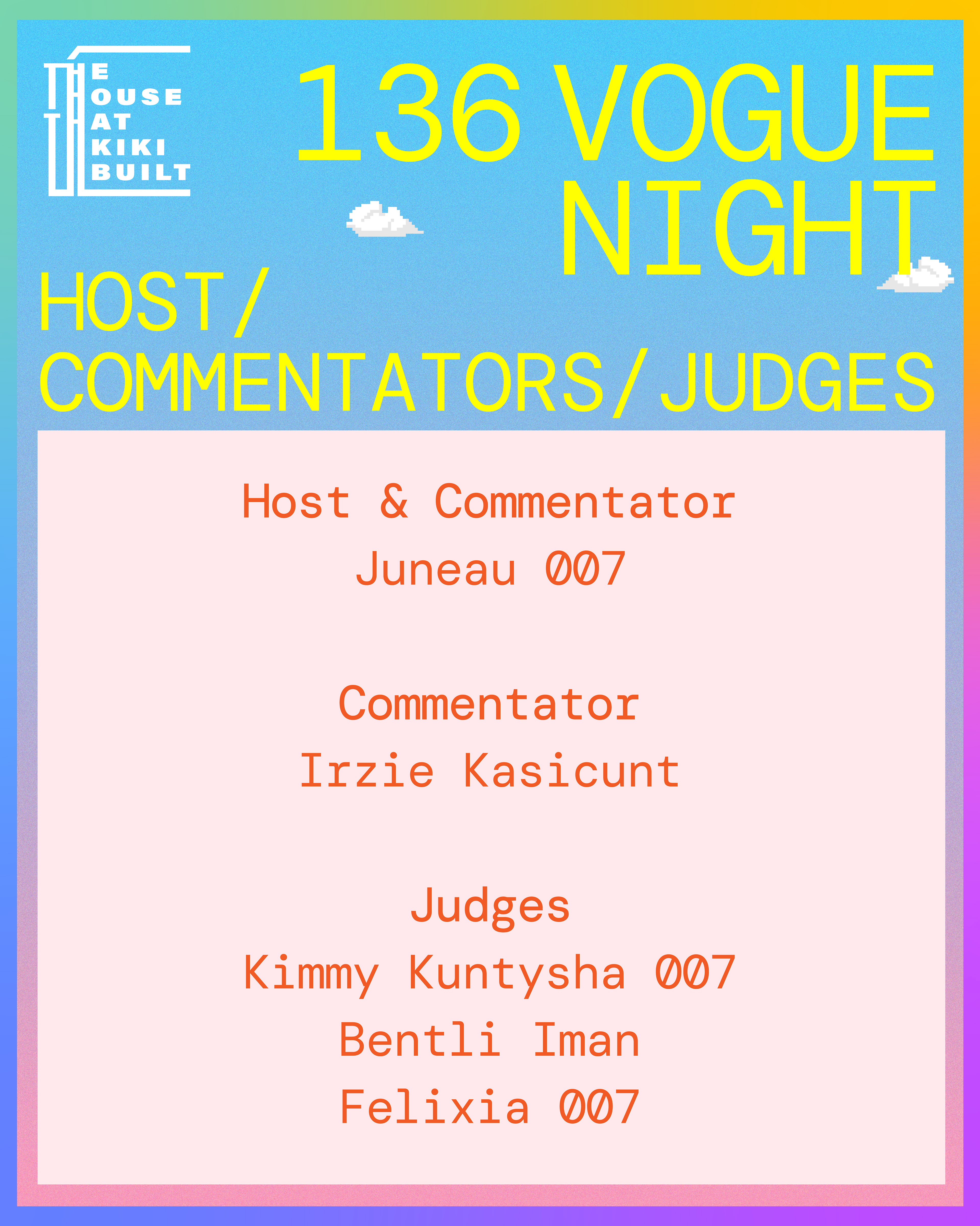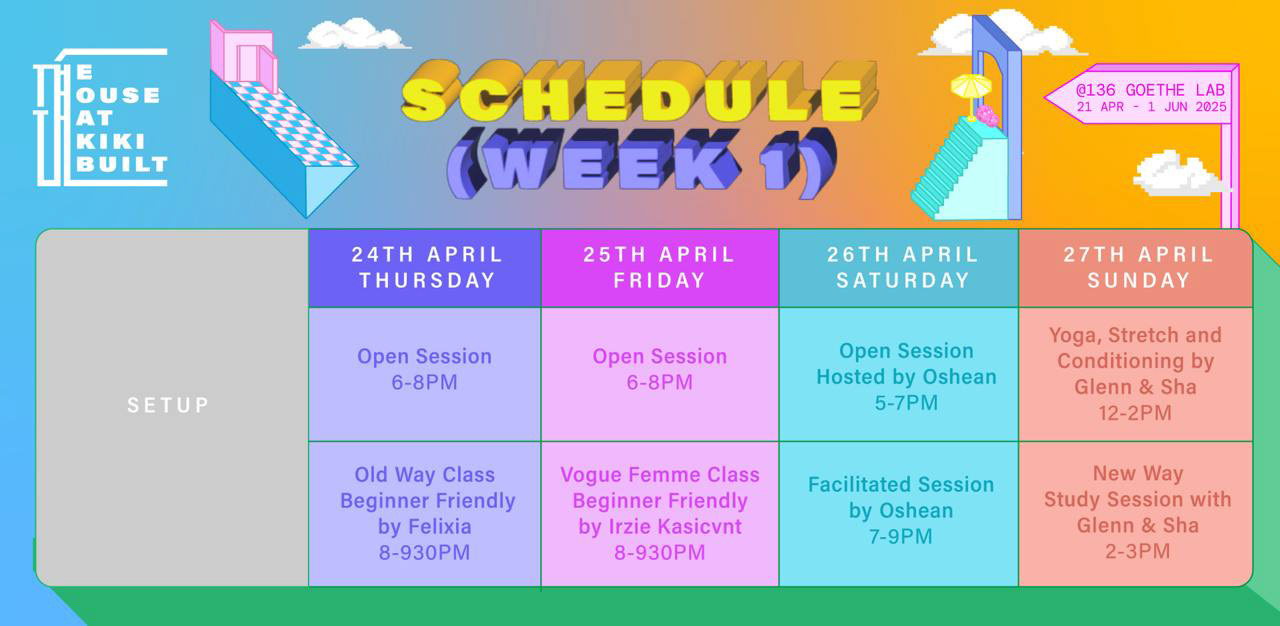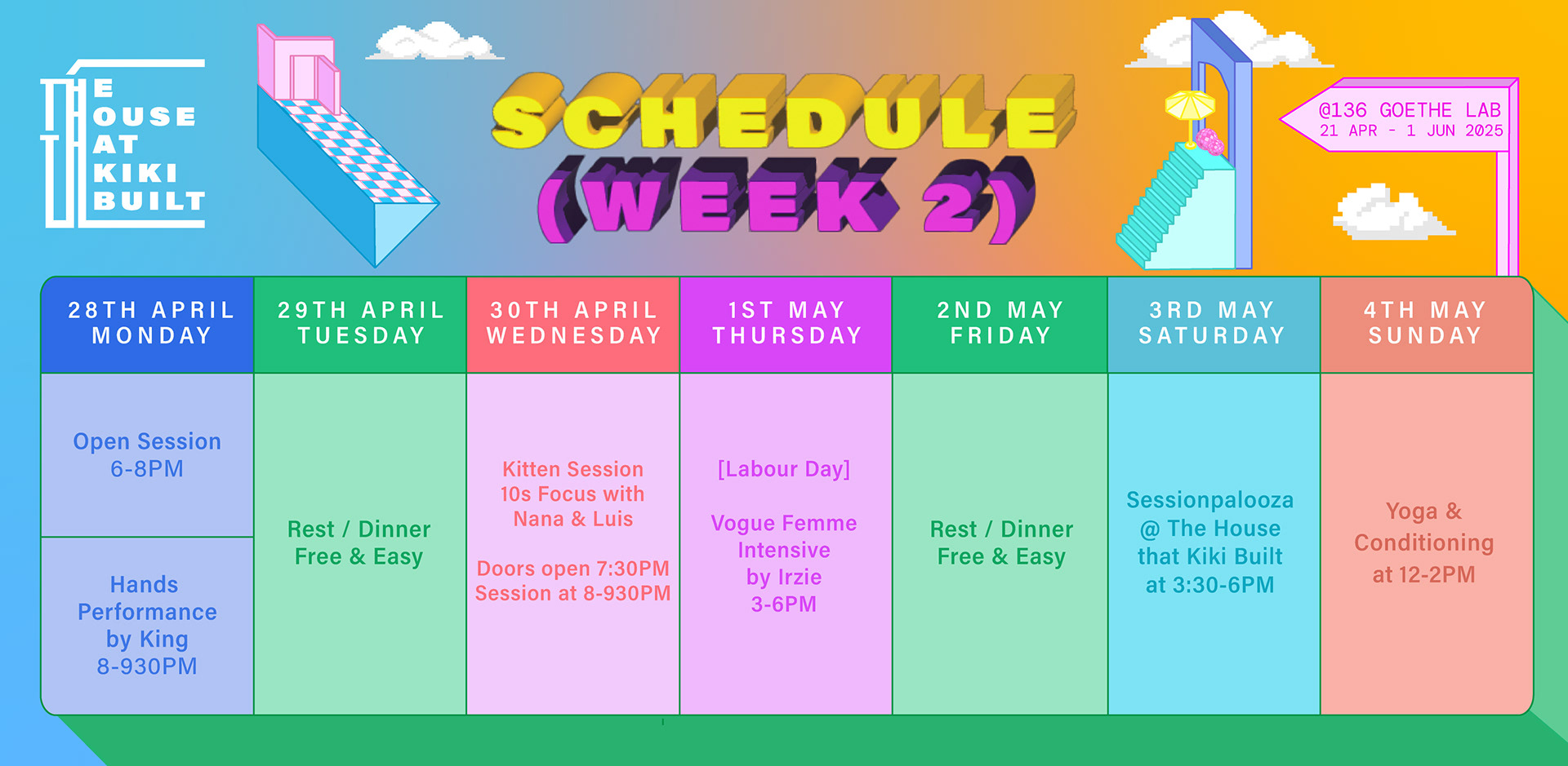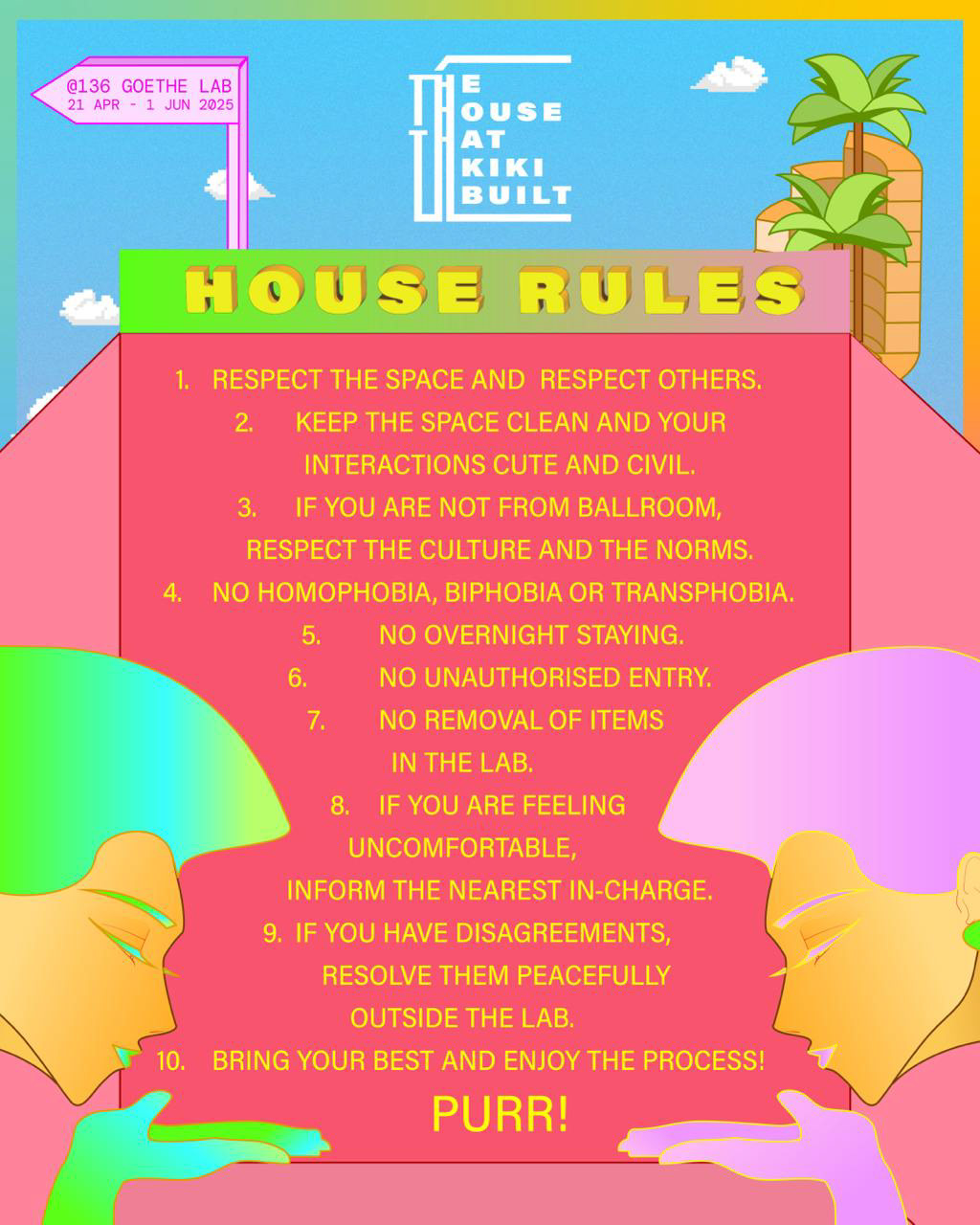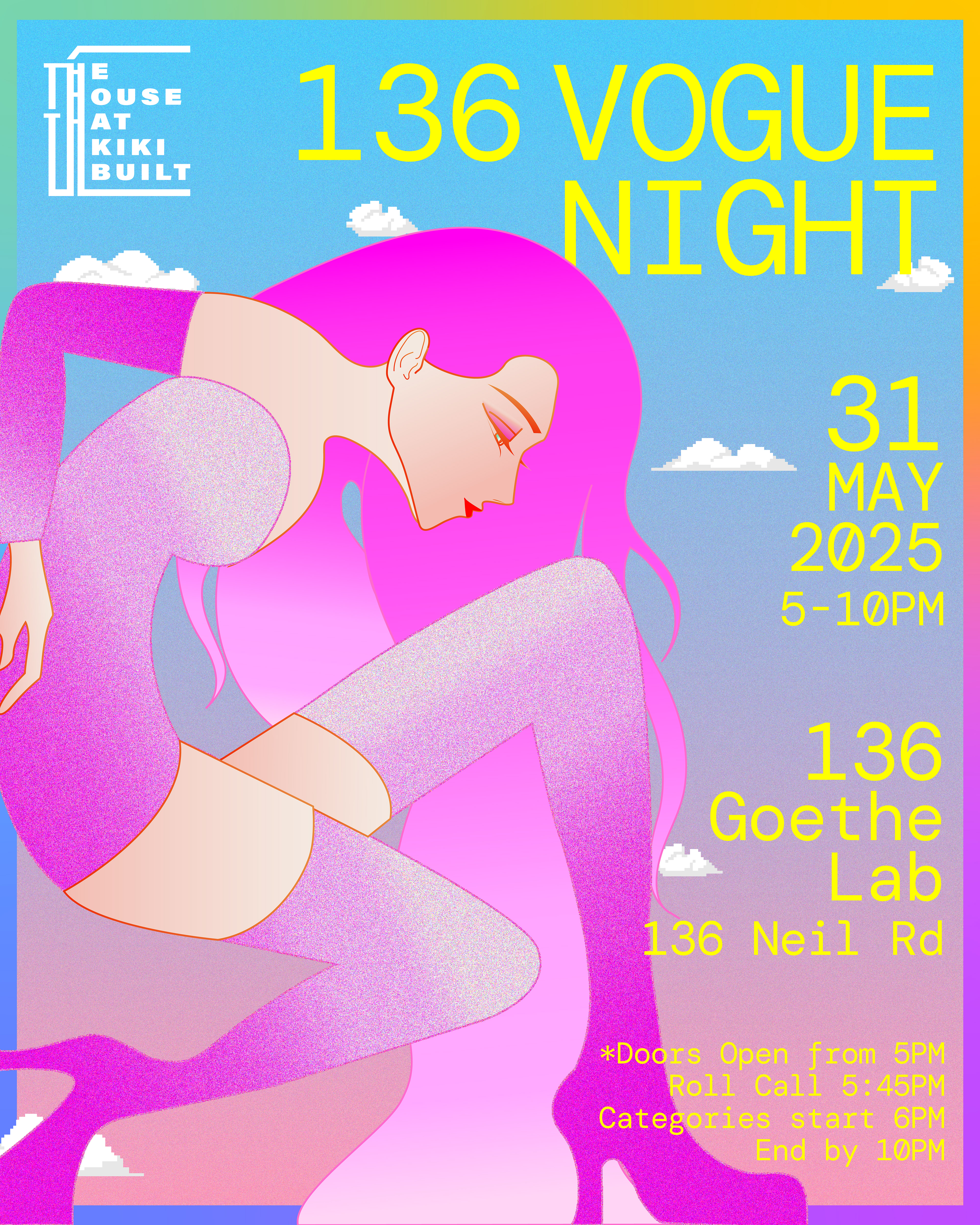 THE HOUSE THAT KIKI BUILT is a process-based transdisciplinary project invoking underground Ballroom practices, aesthetics and performance. Underground Ballroom culture originated in Harlem, New York City by the Black and Latinx queer and trans community in the late 60s, and has now expanded globally. Kiki is a derivative of the major Ballroom scene which focuses on youth-engagement, advocacy and equitable access to Ballroom culture and functions. The Ballroom House is an alternative kinship structure; chosen families constructed by House Parents and Children, providing an informal but deeply committed infrastructure of care, safety and mentorship. Extending the metaphor of the House, the project harnesses the nexus of creative labouring within the underground Singaporean Ballroom scene and transforms 136 Goethe Lab into a community clubhouse for the community. While in residence, the community gathers as a research and generative network through facilitated practice sessions, category study, discussion and interview sessions with overseas Ballroom figures, contributing to shared understandings of Ballroom’s colourful histories and present(s). We seek to dive into the epistemologies of situated knowledge in Ballroom culture, deepen our craft and artistries in the expressive modes of Vogueing, fashion-making & presentation, and Ballroom-specific musicking as communal praxes of self-affirming glamour-as-resistance. We will programme several public outreach programmes for new friends and allies who are interested to learn more about underground Ballroom and our local scene and to pick up the many skills that underground Ballroom has gifted to her initiates. present(s). Artist Residency Lead by Shayus (Ada) Sharif Visuals Designed by Fel (Felicia) Utama